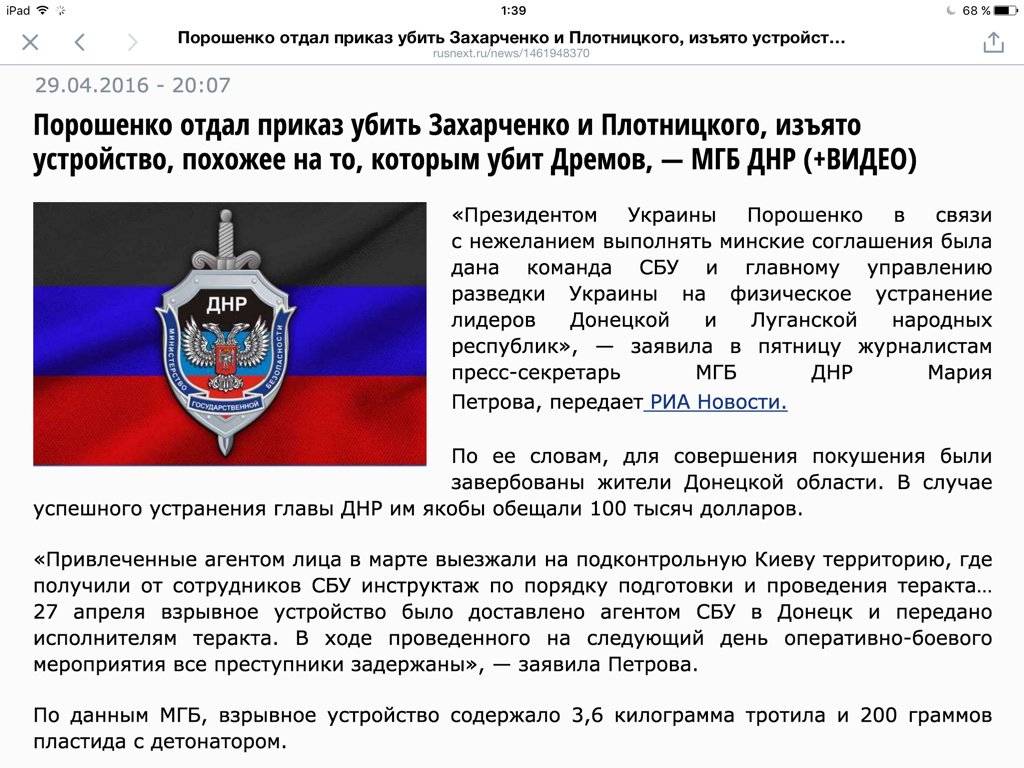 «Я буду ходатайствовать перед министерством госбезобасности и Генпрокуратурой ДНР об открытии уголовного дела против *президента* Украины Порошенко. Все, кто виновен в развязывании войны на Донбассе, пускай получат по заслугам», — сказал Захарченко.